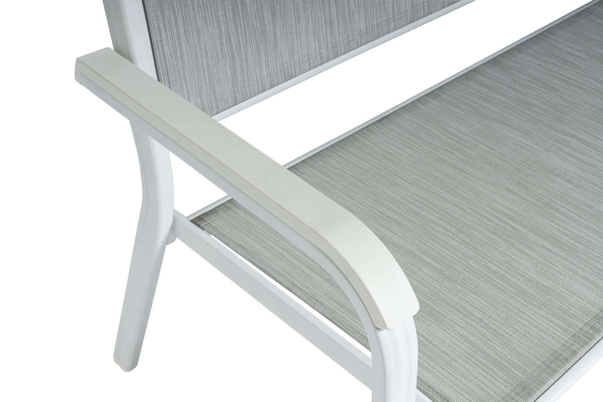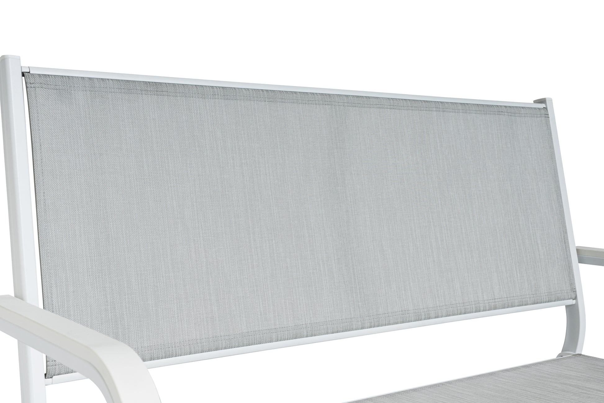 Die KETTLER Basic Plus 2er-Bank kombiniert modernes Design mit höchstem Sitzkomfort. Mit ihrem pulverbeschichteten Aluminiumgestell in weiß matt und dem luftdurchlässigen, pflegeleichten Outdoorgewebe in hellgrau eignet sie sich ideal für den Einsatz im Freien – ob auf dem Balkon, der Terrasse oder im Garten.