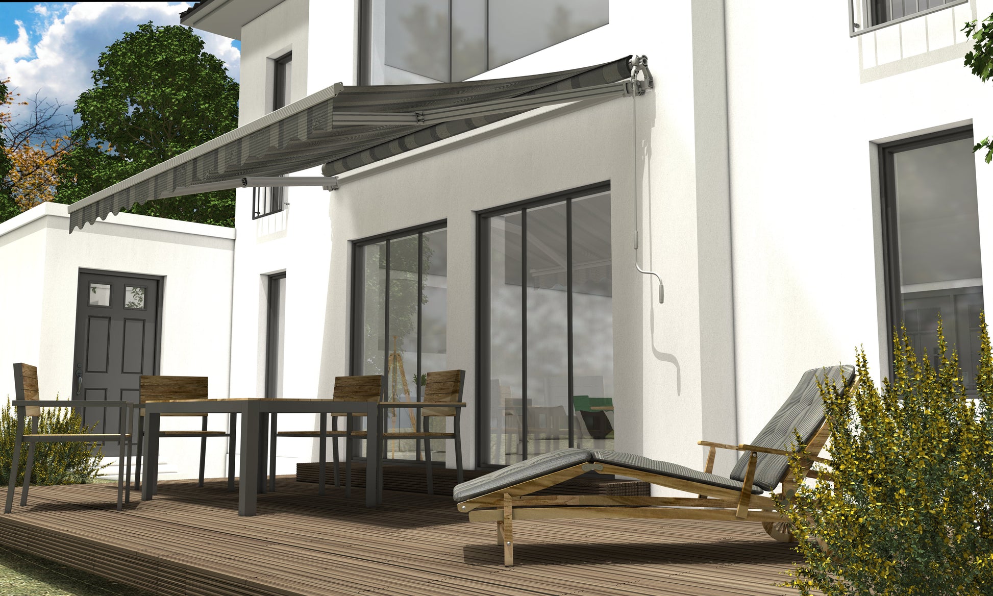 - Fallstange & Gelenkarme: Pulverbeschichtetes Aluminium für extra Witterungsbeständigkeit