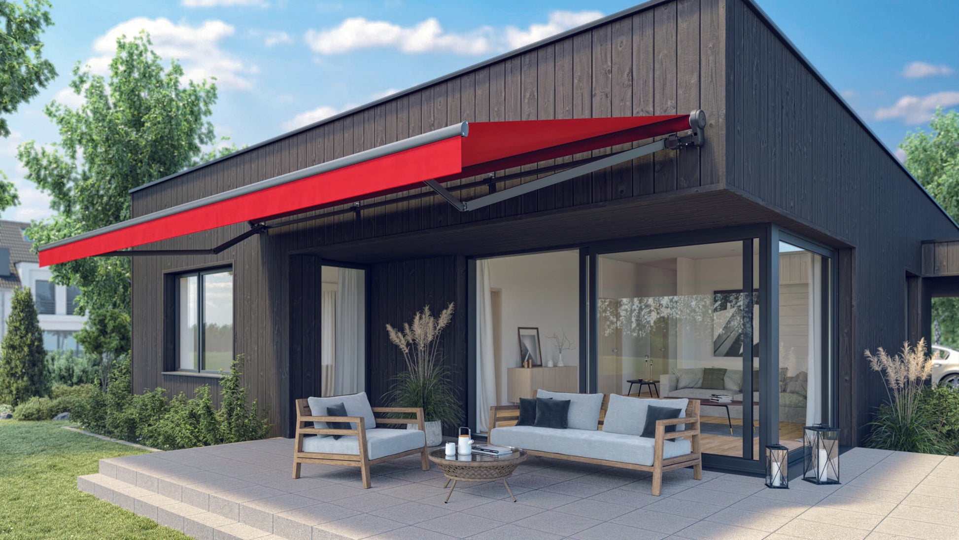 Schlichtes Design, hohe Funktionalität und langlebige Qualität – die offene Markise SOL O5020 passt sich dezent jedem Ambiente an.